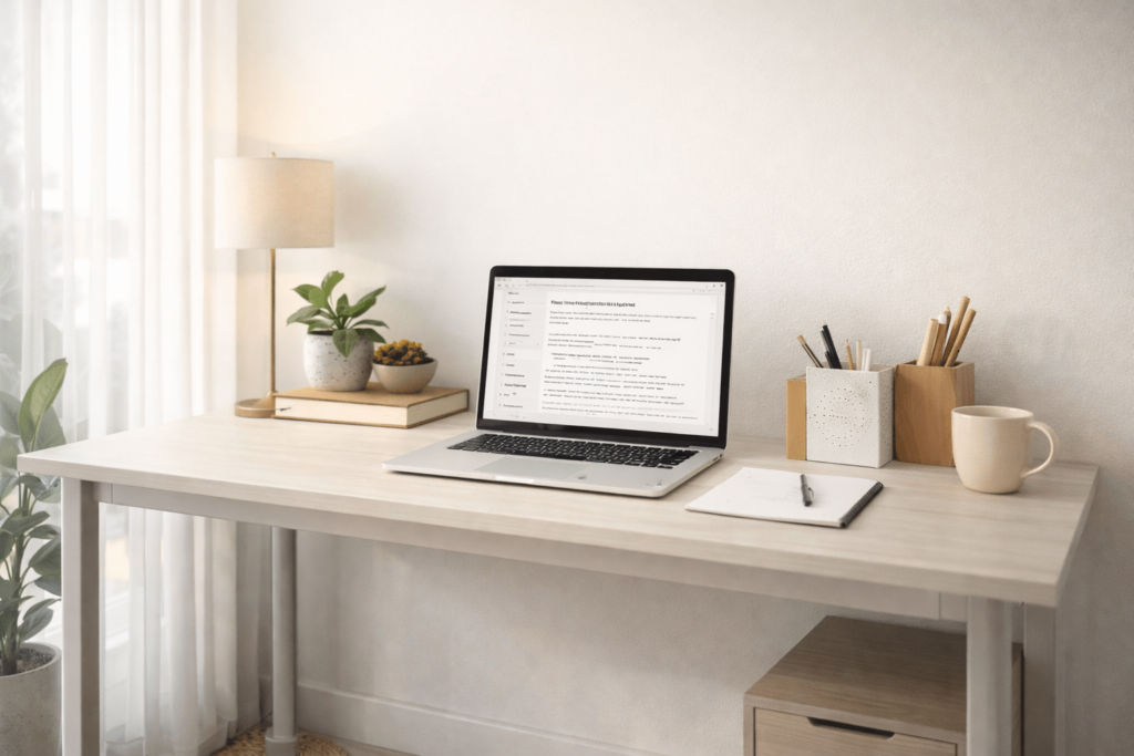 Alt text: “Minimalist workspace with tidy surfaces for focus.”